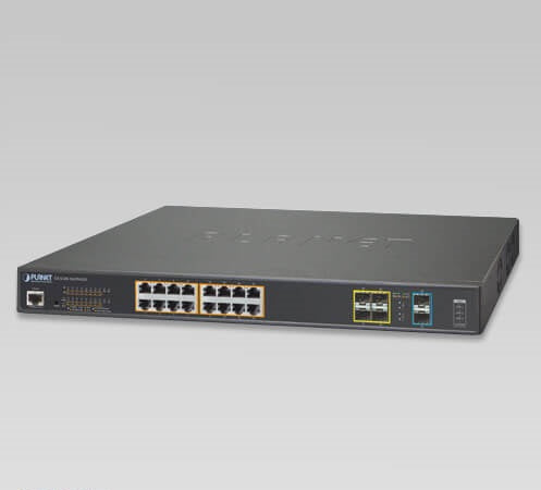 The GS-5220-16UP4S2X is a 1U, Gigabit Ultra PoE Managed Switch featuring PLANET intelligent PoE functions to improve the availability of critical business applications.