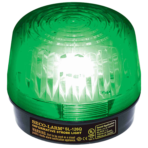 SECO-LARM - SL-126-A24Q/G - 6~24 VDC (2-wire connection) Strobe Light. “U”-Type Xenon tube. 100,000 Candlepower, over 100 flashes/min, 150mA current draw at 24VDC. Green lens.